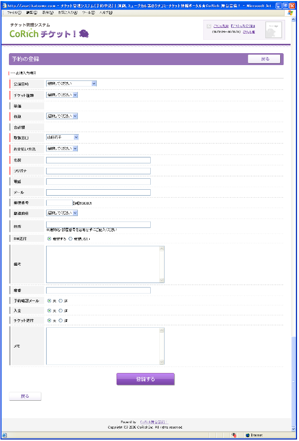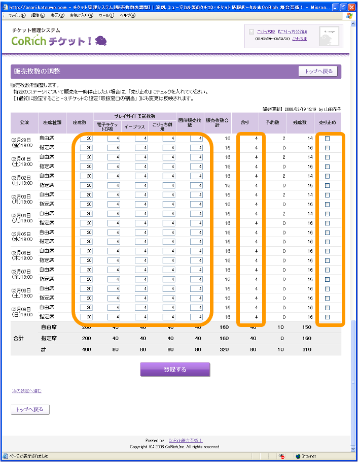 〔登録する〕ボタンをクリックした時点で、一般向けおよび関係者向けの両方の予約受付を停止できます。 - ■座席数・プレイガイド委託枚数・団体販売枚数